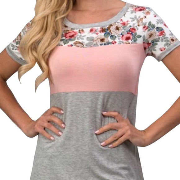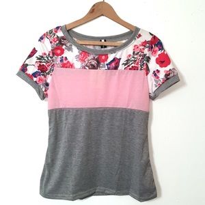 Light pink and gray color block t-shirt with floral pattern up top.