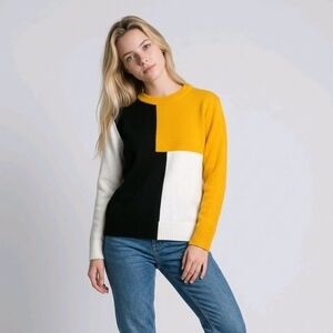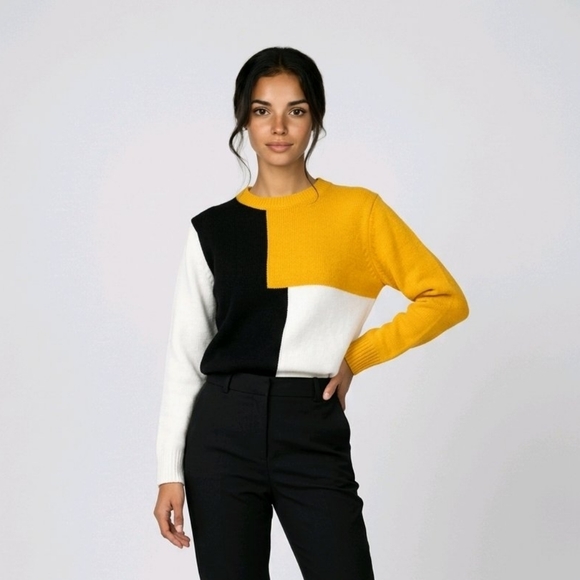This color block knit sweater is the perfect statement piece for your wardrobe. Featuring a bold mix of black, white, and mustard yellow, it gives a modern and stylish look while staying comfortable.