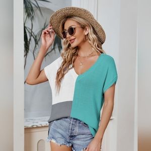 This Color Block V-Neck Knit Top is a must-have addition to your casual wardrobe. With a regular fit and color block pattern, it offers a trendy and versatile style. The plunge neckline adds a touch of allure, while the ribbed detailing enhances the texture and visual appeal. The long length and short sleeves make it perfect for transitional weather. Crafted from a blend of rayon and nylon, this top offers a slight stretch for added comfort. Pair it with jeans or leggings for a stylish and comfortable everyday look.