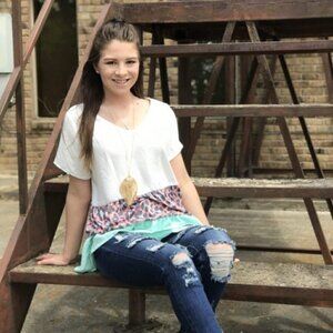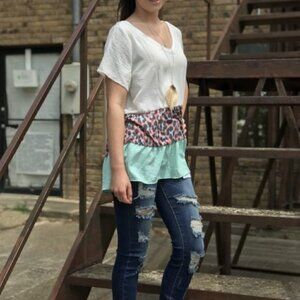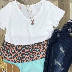 NWT-Rainbow Leopard, Aqua and White are the colors in this color block babydoll swing top. Lighweight and roomy fit. Fabric is 100% polyester knit with spandex for some stretchiness. Model is wearing size S. Accessories, jeans and shoes not included.