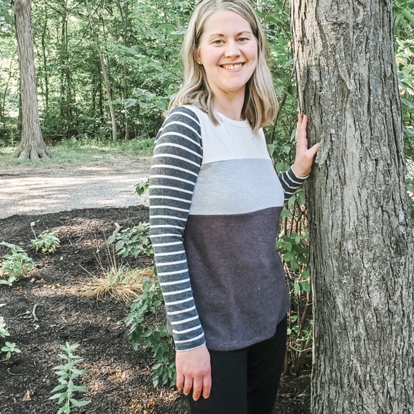 Super duper soft neutral color block sweater top! A mix of ivory, gray and charcoal colors. Fits true to size.