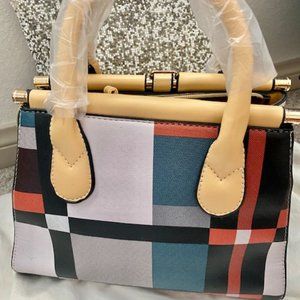 New Color Block handbag with tan handle and includes a tan shoulder strap.