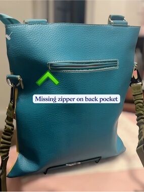 Callout- back zippered pocket is missing the zipper.