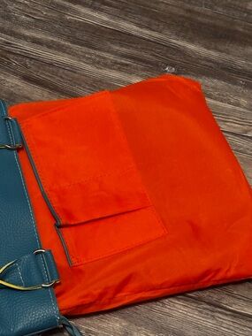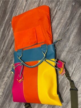 New unbranded tote with a vibrant color-block design - teal,fusha,orange, and yellow. Floral cut design bag charms on each strap. Lightweight and versatile for everyday use. Adjustable shoulder strap for comfortable wear. Secure top opening with decorative charms for a playful touch. Bright colors add a bold accent to any outfit.