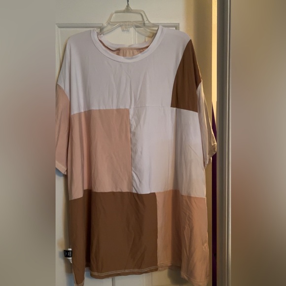 Stylish oversized shirt with a color block design. Features shades of cream, tan, and brown.