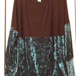 EUC Womens Color Block Oversized Top. Black polyester/spandex on top; green polyester/spandex velvet on bottom. Fitted 4” wrist cuffs create a stylish fit.