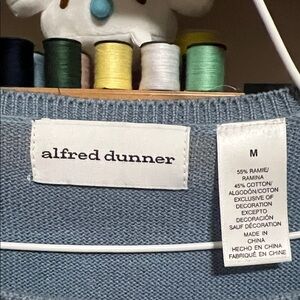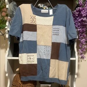 Stylish color block knit top with patchwork design. Features shades of blue, cream, and brown. Has shoulder pads