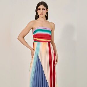 This stunning strapless maxi dress features a vibrant color palette of vertical stripes and a pleated texture that creates an elegant silhouette. The top is stretchy strapless bandeau style. It’s lightweight and flowy. A great choice for adding a pop of color to any occasion.