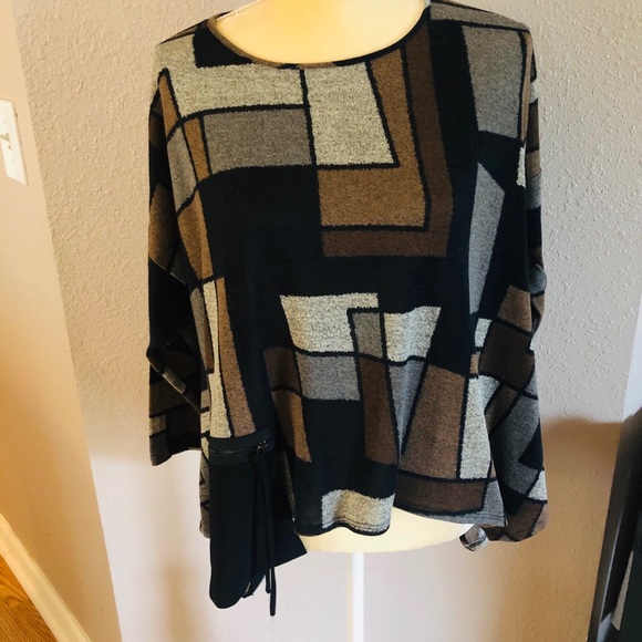 Black, gray, and tan color block poncho with zip pocket detail. Great condition!