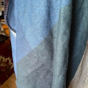 Stylish color block poncho with a cozy design. Features shades of red, blue, and gray.New with Tags it wraps around to fit any size