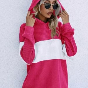 Pink rib knit hoodie with white color blocking