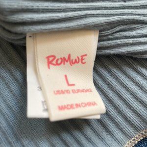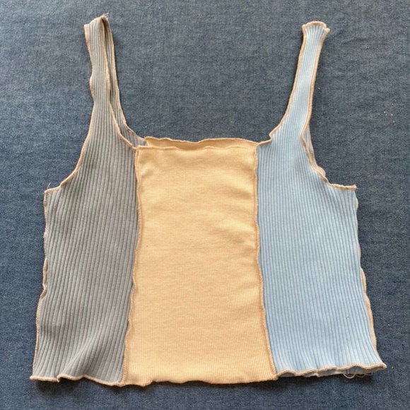 Color Block, ribbed tank top, unworn from Romwe. While the tag says large, it is a tight fit, and would work as a small or medium as well. Colors are cream, light blue, and gray-blue, with different size ribbing in each panel.