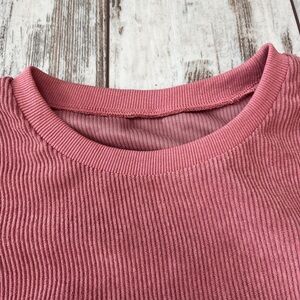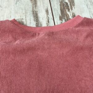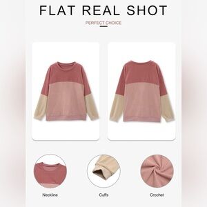 This cozy long-sleeve sweatshirt offers a unique textured look with its ribbed, corduroy-style knit. Featuring a stylish color block design in shades of pink, mauve, and cream, this pullover is designed with a very oversized, relaxed fit and dropped shoulders for ultimate comfort. The tunic-length hem makes it perfect for pairing with leggings or skinny jeans. Made from a soft polyester blend, it’s a lightweight yet warm choice for fall and winter layering.