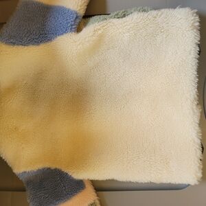 Cozy sherpa jacket with color block design. Features cream, blue, pink, and green patches. Perfect for a stylish and warm look.