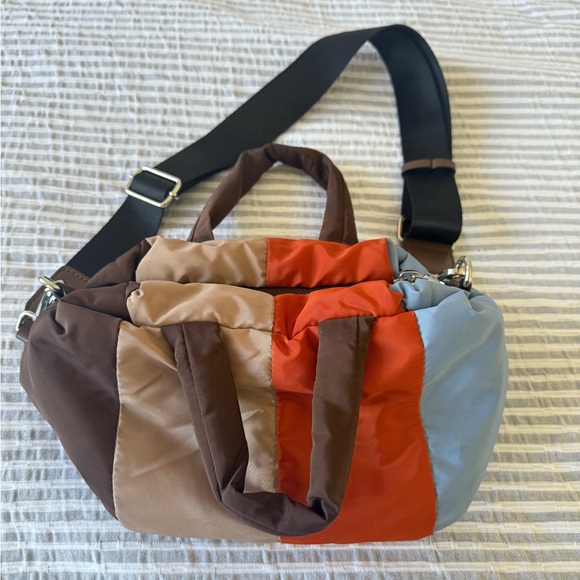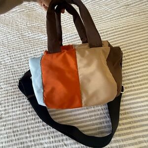 Stylish color block shoulder bag with a mix of brown, tan, orange, and blue panels. Features a comfortable strap and dual handles. Nylon, highly durable! Adjustable strap! Measurements in pictures!
