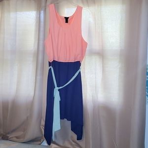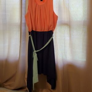 Coral, navy and mint dress. Falls right over the knee(I'm 5'6) used twice. Still is great condition. Has a detachable belt. Its double lined and has a slip underneath the skirt part as well. *smoke free home*