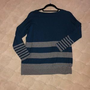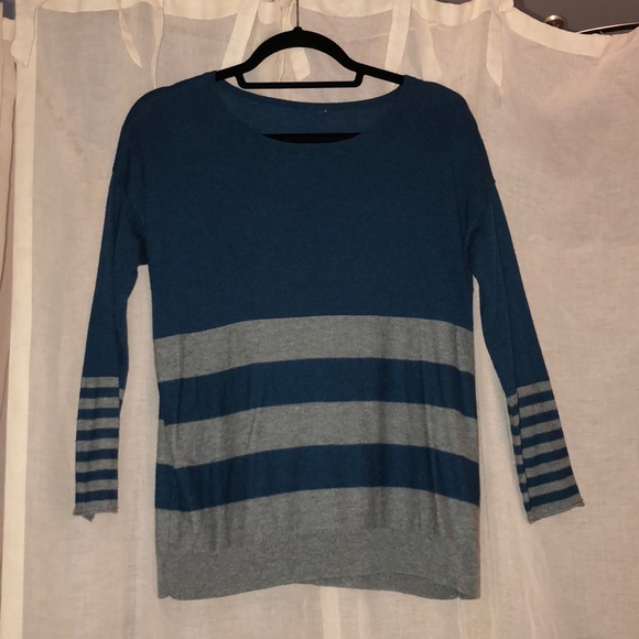 Wool blend sweater featuring blue/grey color block design and crew neck. Very cozy!