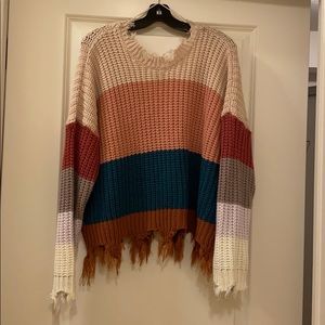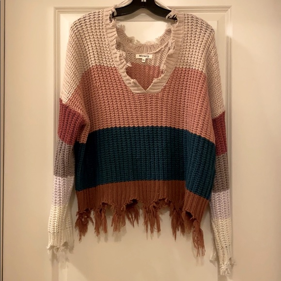 Never worn. No tags. No sign of wear. Cream, Muave, teal, rust colors on the body. Cream, dark pink, brown, lavender, and white on sleeves! Size M/L