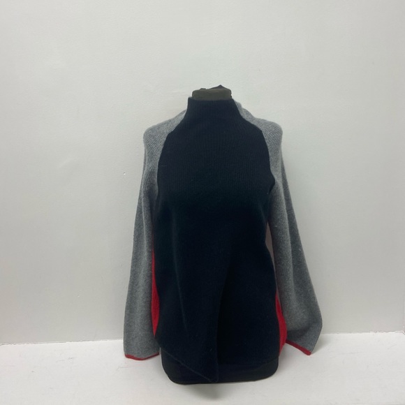 Soft mock neck sweater with a black front, red back, and grey sleeves.