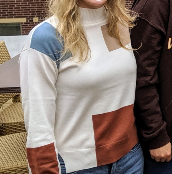 Color Block Sweater from Bohme. Mock turtleneck cut with beautiful camel, sand, and powder blue color blocks.