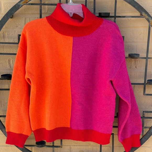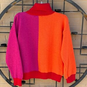 Vibrant colored turtleneck made of acrylic and polyester is sure to be noticed! A warm, thick knit with lots of personality! Slightly oversized fit so listing as a S/M.