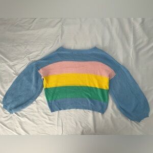 Blue, pink, yellow, green sweater. Widens out towards the forearm giving the sweater a bold look.