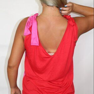 The Bibi tank has a pink and red color block detail. Neckline is a v-neck and the sleeves have the cutest tie detail. Tops run on the larger side and are perfect for all seasons.