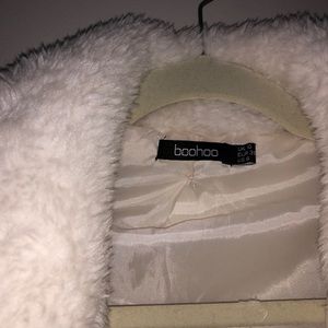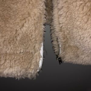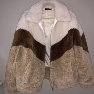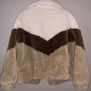 White, tan, and brown color block zip-up fluffy teddy jacket.