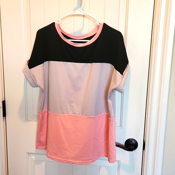 Pink, gray and black color block tee. Rolled detail on sleeves. Excellent condition...only worn a few times. Shein, size XL. Poly/cotton blend.