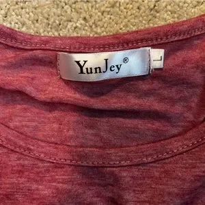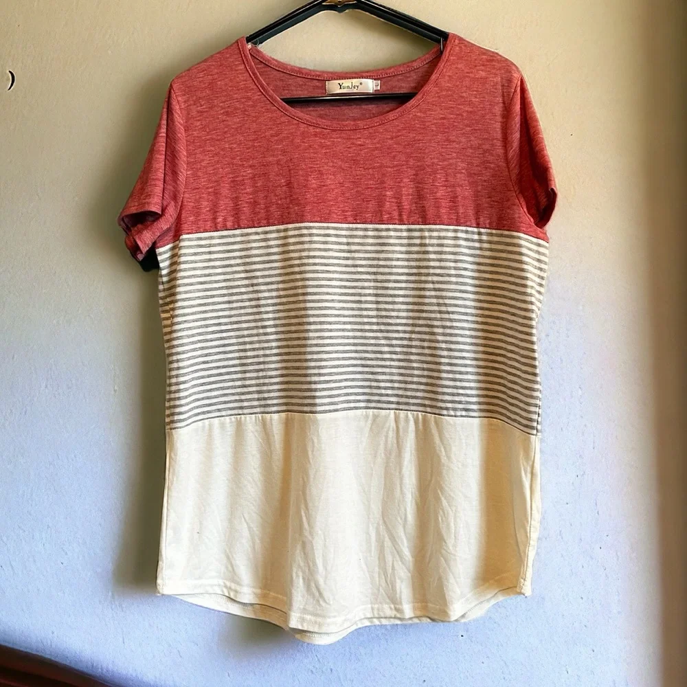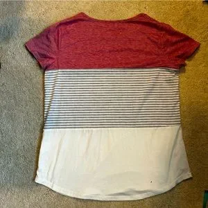 Cute color blocked tee shirt with rounded bottom hem. Approximately 20” PTP and 27” long. 35% cotton and 65% polyester. Excellent Preloved condition.
