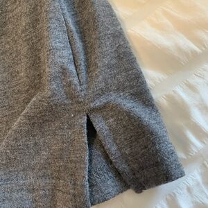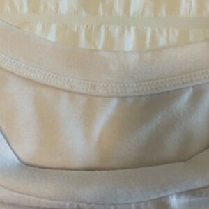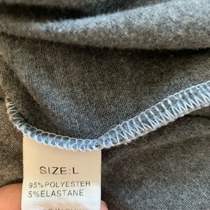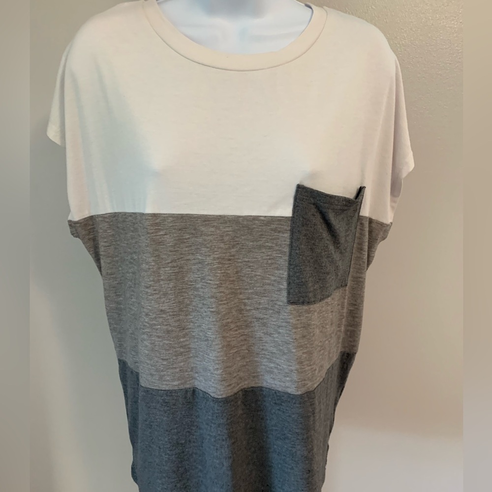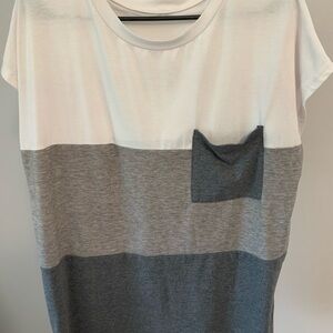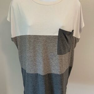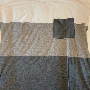 Color Block Tee. Size large is 95% polyester and 5% Elastane. Shirt sleeve tee has no brand tag. Tee is white, light gray and dark gray with a front pocket and side slits.