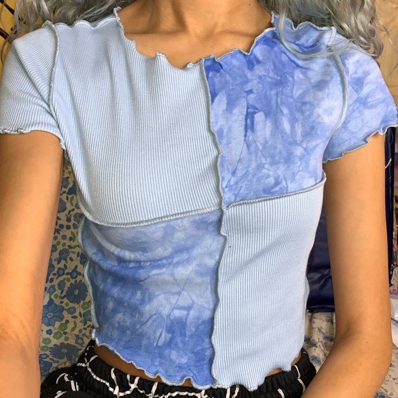 ☆ pastel blue color block contrast stitch top ☆ size xs-small, modeled on an xs with a small b cup ☆ beautiful and unique fabrics that stretch ☆ one is a cloudy tie dye esque pattern & the other is lightly ribbed baby blue ☆ it is cropped & shows your belly a lil + has the cutest lettuce trim edges ☆