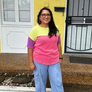 Color block tee with the cutest color combos?! We are OBSESSED!! This tee gives the perfect oversized fit and goes great with all bottoms! Jeans, trousers, cargos, skirts, leggings- you name it! The coral, purple, and green makes it easy to style with so many colors and neutrals!