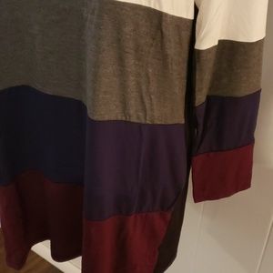 Color block tunic, perfect to pair with leggings and boots for fall! Heather gray, white, dark heather gray, navy, and maroon. Black back, with brown elbow patches. 31 inches long, 20 inch waist, 23 inch hips. Sleeve length 21 inches. Item is new without tags, never been worn!