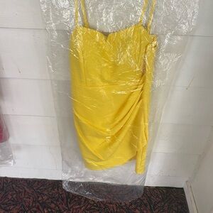 Turn heads in this vibrant yellow cocktail dress, crafted with a flattering bodycon silhouette and delicate spaghetti straps. Featuring elegant draping on one side for a chic, figure-enhancing effect, this dress is perfect for summer parties, date nights, or special occasions.