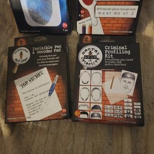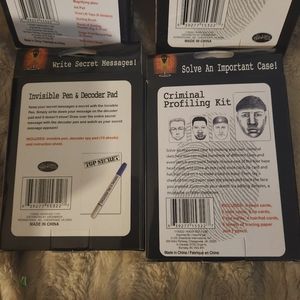 Color Code Message kit, Criminal Profiling kit, Invisible Pen & Decoder pad, and Finger Print kit- spy gear and secret detective gear for kids to learn. One says 7+ years.