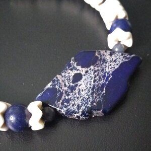 The focal center stone of this statement bracelet is a piece of natural Sea Sediment Jasper in navy dark blue with cream veins. The 2 large dark blue beads are color enhanced Lapis Lazuli, the smaller smoky blueberry colored stone beads are Agates. The creamy white crinkle cut bead stacks are natural Howlite. Bracelet securely closes with a lobster claw clasp.