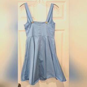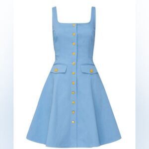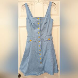Color Me Courtney Alle blue Utility cotton stretch Dress gold buttons size 4. Blue canvas twill (98% Cotton, 2% Spandex). Full skirt. Sleeveless. Square neckline. Flat metal buttons. Front Pockets. 36.5" from shoulder to hemline. Like new condition