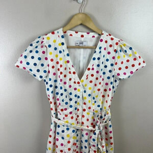 A cotton poplin dress, fit and flare with sash belt and button front.White with polka dots cotton poplin (97% cotton 3% SP).Hourglass. Short sleeves. V-neckline. Self covered buttons at placket. Partially lined. Side Pockets.Rainbow, Polka Dot, Teacher, Maximalist, Bright, Vacation, Work, Office, Photo Shoot, Bridal Shower, Baby Shower, Brunch.
