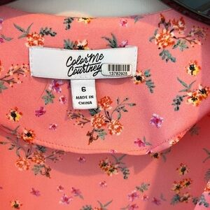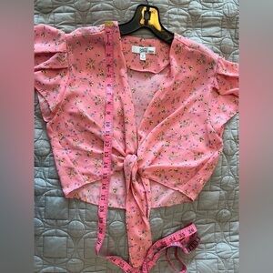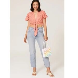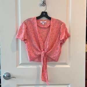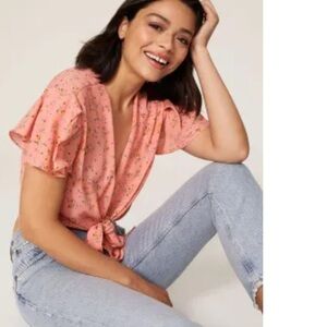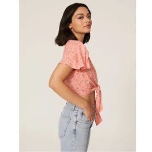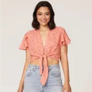 Crop it like it's hot in this peachy-printed Color Me Courtney top styled with a flutter sleeves and tie waist.