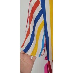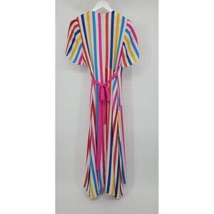 White multi stripe polyester (100% Polyester). Wrap. Short sleeves. V-neckline. Wrap belt closure. Fully lined. 51" from shoulder to hemline. I