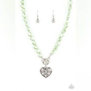 An imperfect collection of pearly green beads are threaded along an invisible wire below the collar, creating a colorful display. Dotted in glittery white rhinestones, an airy silver heart pendant sparkles at the center for a flirtatious finish. Features a toggle closure.