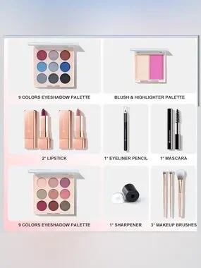 【All-in-One Makeup Kit for Beginners & Lovers】Our complete makeup set includes 2×9-color eyeshadow palettes, 1 blush & highlighter palette, 2 lipsticks, 1 sharpener, 1 eyeliner pencil, 1 mascara, and 3 professional brushes—no extra tools needed! It fulfills all makeup needs to create a flawless finish.