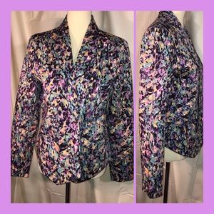 Awesome little jacket in a bunch of colors splashed on a black background; pinks, purples, teals, yellow, and white. Very like an abstract water color print. Obviously goes with almost every solid color item. Open front style with full length lapel tapering up and fastened at the bottom. Slit pockets in front. Fully lined in black, mostly cotton (98%) with a touch of spandex for stretch.