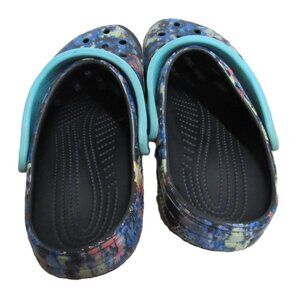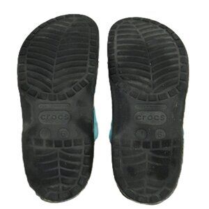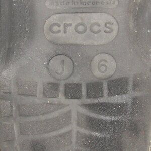 Crocs in a paint splotch/rainbow pattern is a size Y (youth) 6. These are wide and for kids that have outgrown C (child) size or adult with wider foot; equivalent to a women's 8, men's 6. One of the Croc emblems on one side is almost completely gone-see close-up.