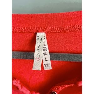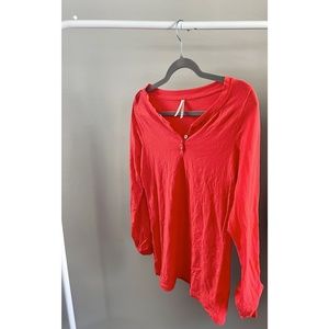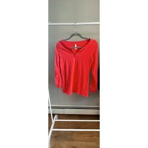 Color story quarter sleeve in a size L. I don't like how it looks on me. Stretchy. The buttons are functional and will undo the scrunch in the sleeve. Not quite orange but not quite a salmon color either.