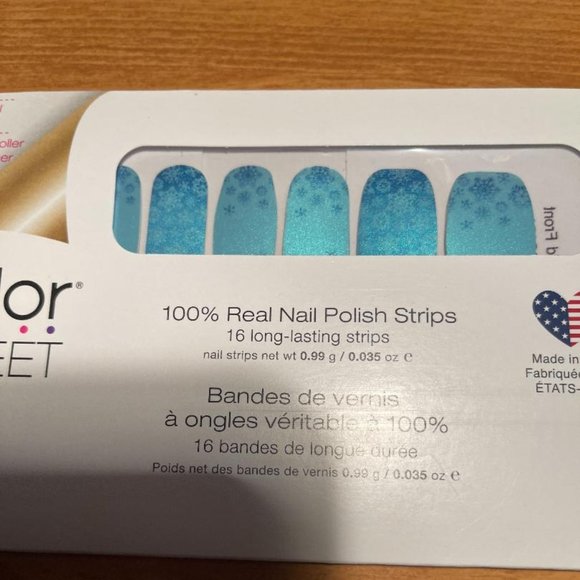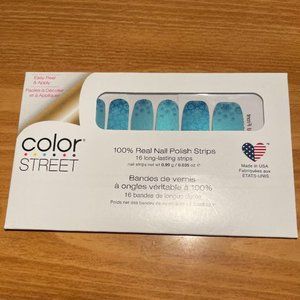 Color Street nail strips. Feeling frosty? Top your tips with Cold Front, a wintry design of delicate snowflakes in shades of blue. Shimmer finish. New in package.