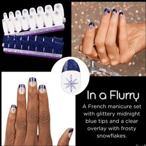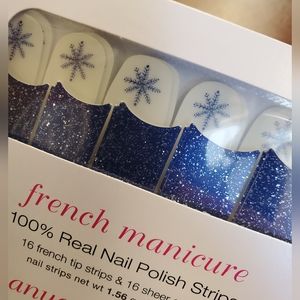 100% Real Nail Polish Strips, 16 glittery midnight blue french tips and 16 clear overlay blue snowflakes, long lasting nail strips, easy peel & apply. Made in the USA. Smoke free home.