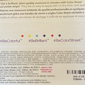 Each set includes 16 double-ended long-lasting nail strips. Easy peel and apply with no dry time. Just apply and go! 100% Real Nail Polish Strips made in the U.S.A. Get a brilliant, salon quality manicure with base coat, color/design and topcoat in minutes with COLOR STREET 100% real dry nail polish strips! Removes with nail polish remover