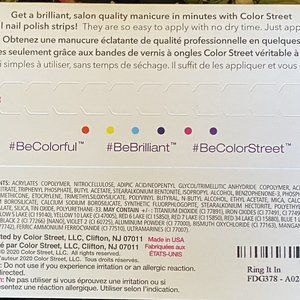 Each set includes 16 double-ended long-lasting nail strips. Easy peel and apply with no dry time. Just apply and go! 100% Real Nail Polish Strips made in the U.S.A. Get a brilliant, salon quality manicure with base coat, color/design and topcoat in minutes with COLOR STREET 100% real dry nail polish strips! Removes with nail polish remover